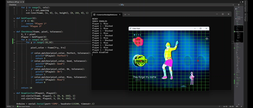 When playing Just Dance, indicators appear on the screen to tell you how well you performed a move. There are four indicators, Perfect, Good, Okay and miss – which is denoted by a red X. As part of this project I wrote a Python program using OpenCV to detect the colour and each indicator. This information is then sent via a serial port to an Arduino, which using my favourite radio modules – NRF24L01 – sends a wireless signal to the electrifying wristbands that I built.